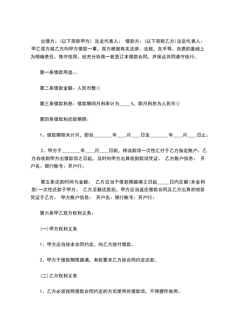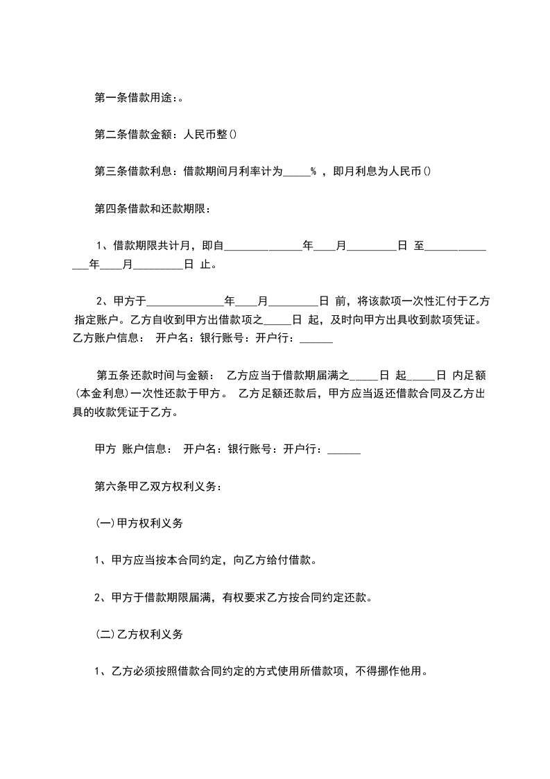 第五条还款时间与金额: 乙方应当于借款期届满之日起_____日内足额(本金利息)一次性还款于甲方。 乙方足额还款后,甲方应当返还借款合同及乙方出具的收款凭证于乙方。 甲方账户信息: 开户名:银行账号:开户行: