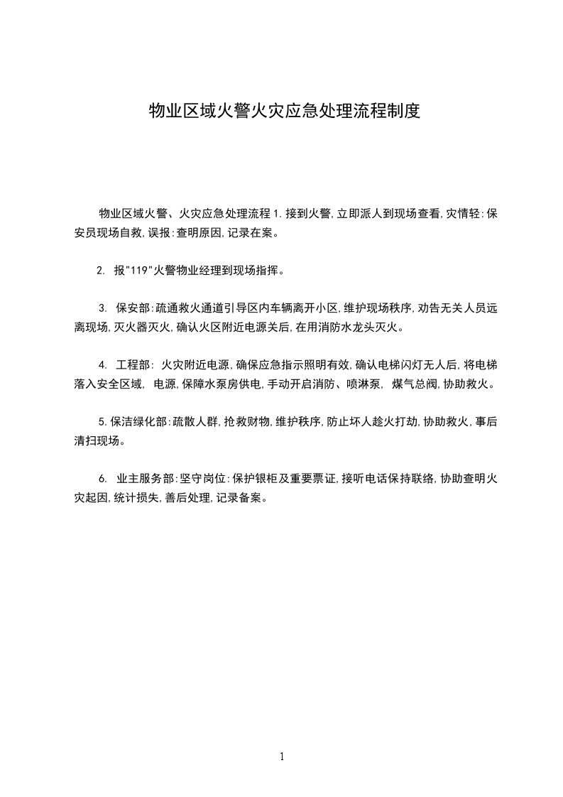 物业区域火警、火灾应急处理流程1.接到火警,立即派人到现场查看,灾情轻:保安员现场自救,误报:查明原因,记录在案。