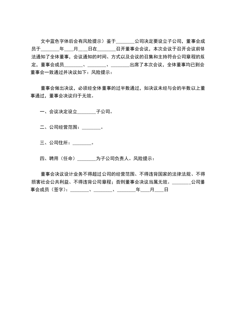 文中蓝色字体后会有风险提示)鉴于________公司决定要设立子公司,董事会成员于________年____月____日在________召开董事会会议,本次会议于召开会议前依法通知了全体董事,会议通知的时间、方式以及会议的召集和主持符合公司章程的规定,董事会成员________、________、________出席了本次会议,全体董事均已到会。董事会一致通过并决议如下:风险提示: