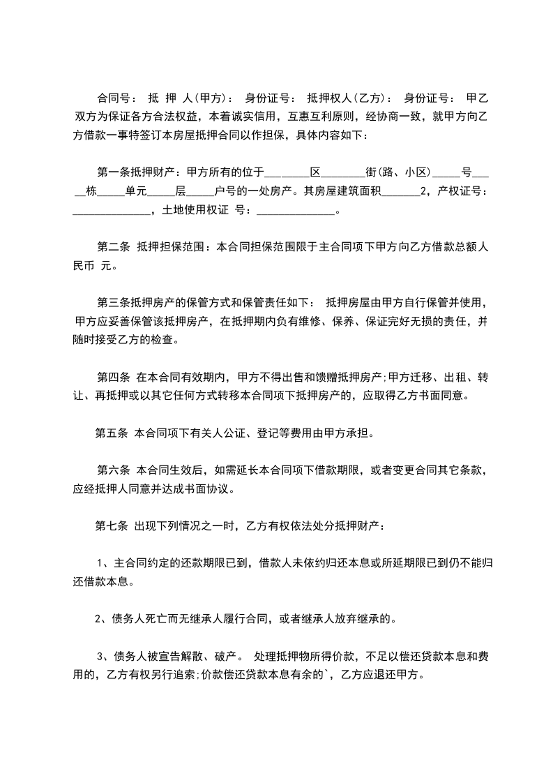 合同号: 抵 押 人(甲方): 身份证号: 抵押权人(乙方): 身份证号: 甲乙双方为保证各方合法权益,本着诚实信用,互惠互利原则,经协商一致,就甲方向乙方借款一事特签订本房屋抵押合同以作担保,具体内容如下: