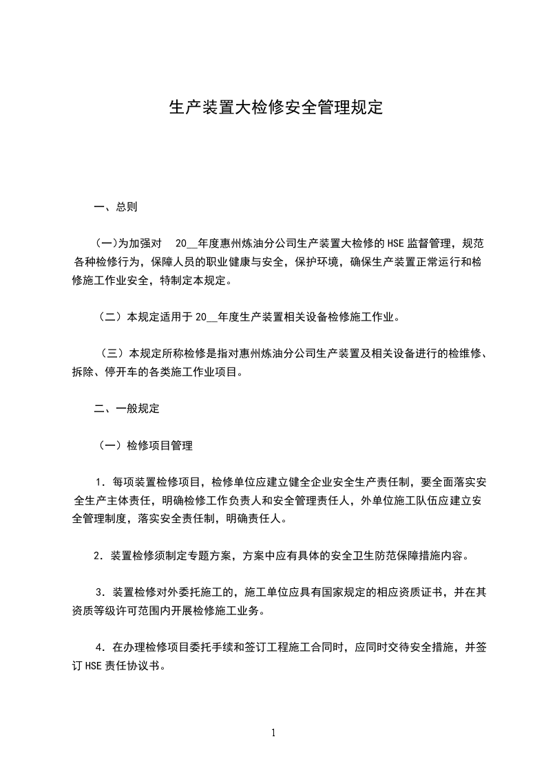 (一)为加强对2024年度惠州炼油分公司生产装置大检修的HSE监督管理,规范各种检修行为,保障人员的职业健康与安全,保护环境,确保生产装置正常运行和检修施工作业安全,特制定本规定。
