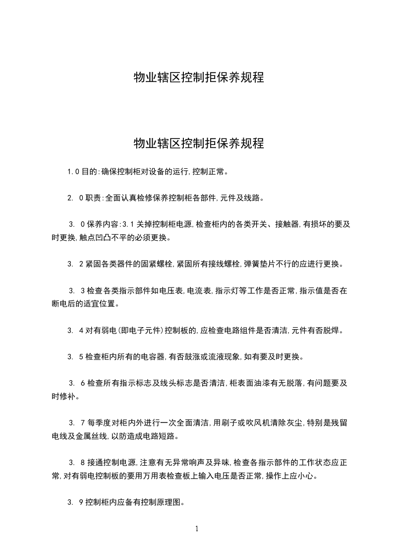 2. 0职责:全面认真检修保养控制柜各部件,元件及线路。