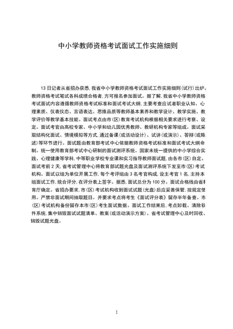 13日记者从省招办获悉,我省中小学教师资格考试面试工作实施细则(试行)出炉。教师资格考试笔试各科成绩合格者,方可报名参加面试。据了解,我省中小学教师资格考试面试内容遵循教师资格考试标准和面试考试大纲,主要考查应试者职业认知、心理素质、仪表仪态、言语表达、思维品质等教师基本素养和教学设计、教学实施、教学评价等教学基本技能。面试考点由市(区)教育考试机构根据相关要求进行考察、设定。面试考官由高校专家、中小学和幼儿园优秀教师、教研机构专家等组成。面试采取结构化面试、情境模拟等方式,通过备课(或活动设计)、试讲(或演示)、答辩(或陈述)等环节进行。面试题由教育部考试中心依据教师资格考试标准和面试考试大纲命制。统一使用教育部考试中心研制的面试测评系统。国家未统一提供的中小学综合实践、心理健康等学科,中等职业学校专业课和实习指导教师面试题,由各市(区)自定。面试考前2天,省考试管理中心将教育部试题光盘及面试测评系统下发至市(区)考试机构。面试以组为单位开展工作,每个考评组由3名考官构成,设主考官1名,主持本组面试工作,统合评分,在评分表上签字。据悉,面试总分为100分。面试合格线由省教育厅确定。省招办要求,市(区)考试机构收到面试试题(光盘)后应妥善保管,按规定使用。严禁非面试期间抽取题目。并要求考点将考生《面试评分表》留存半年备查。市(区)考试机构备份留存本市(区)考生面试数据。面试工作结束后,考点卸载、清除软件系统,集中销毁面试试题清单、教案(或活动演示方案)。省考试管理中心及时回收、销毁试题光盘。