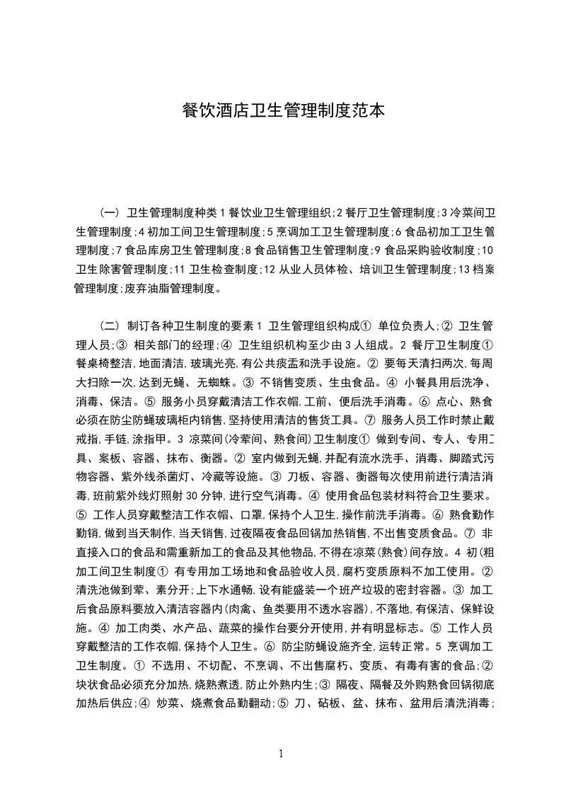 (一) 卫生管理制度种类1餐饮业卫生管理组织;2餐厅卫生管理制度;3冷菜间卫生管理制度;4初加工间卫生管理制度;5烹调加工卫生管理制度;6食品初加工卫生管理制度;7食品库房卫生管理制度;8食品销售卫生管理制度;9食品采购验收制度;10卫生除害管理制度;11卫生检查制度;12从业人员体检、培训卫生管理制度;13档案管理制度;废弃油脂管理制度。
