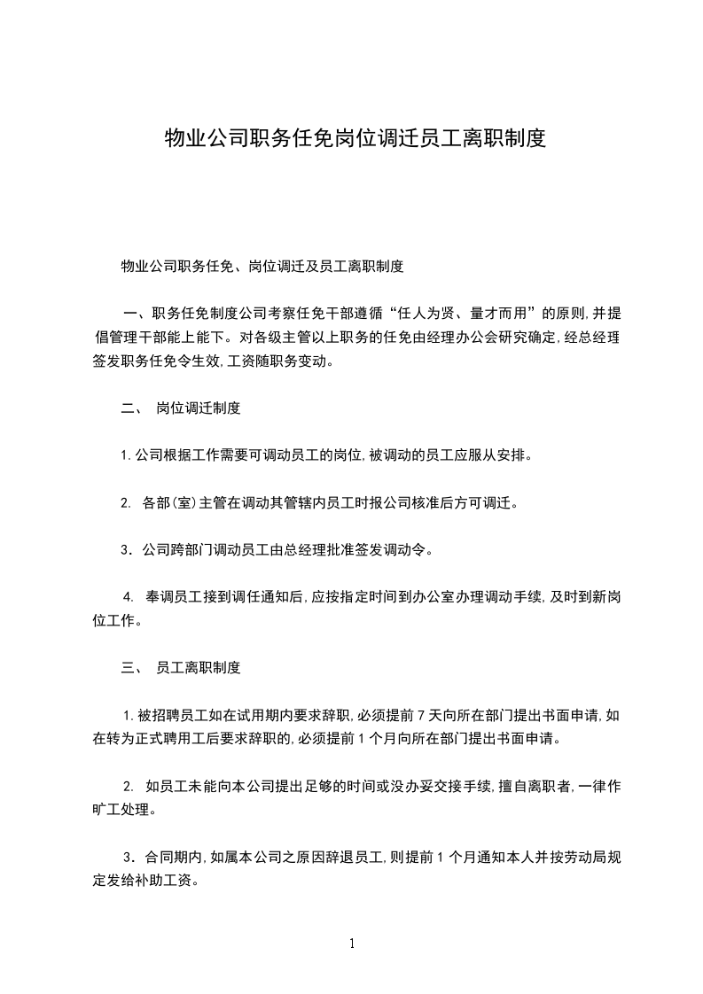 物业公司职务任免、岗位调迁及员工离职制度