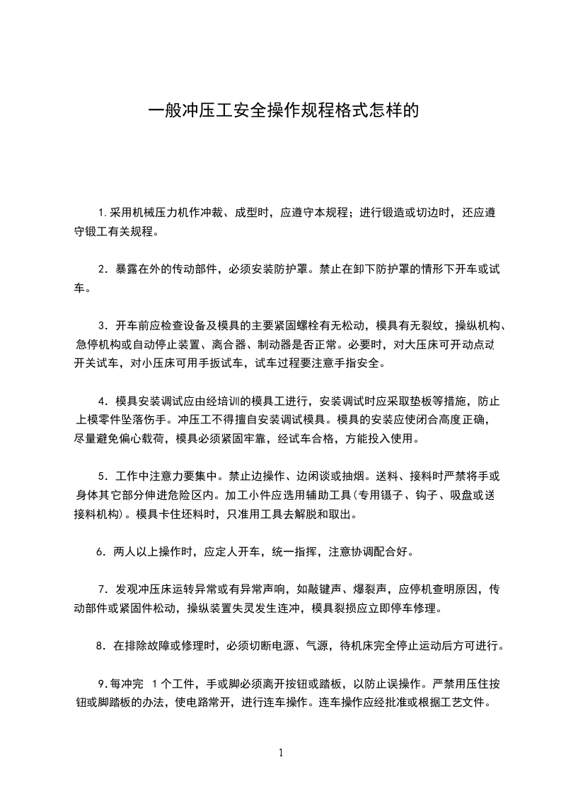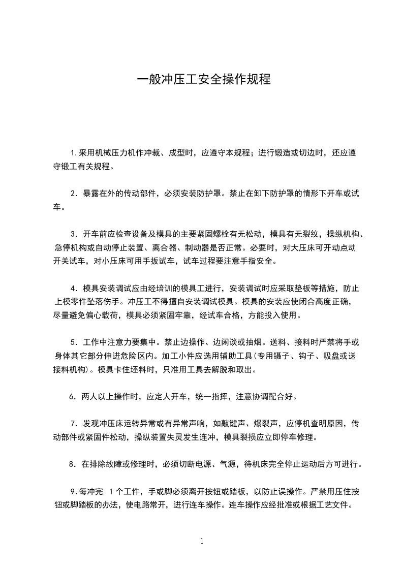 11.配合行车作业时,应遵守挂钩工安全操作规程。 12.生产中坯料及工件堆放要稳妥、整齐、不超高,冲压床工作台上禁止堆放坯料或其它物件,废料应及时清理。 13.工作完毕,应将模具落靠,切断电源、气源,并认真收拾所用工具和清理现场。