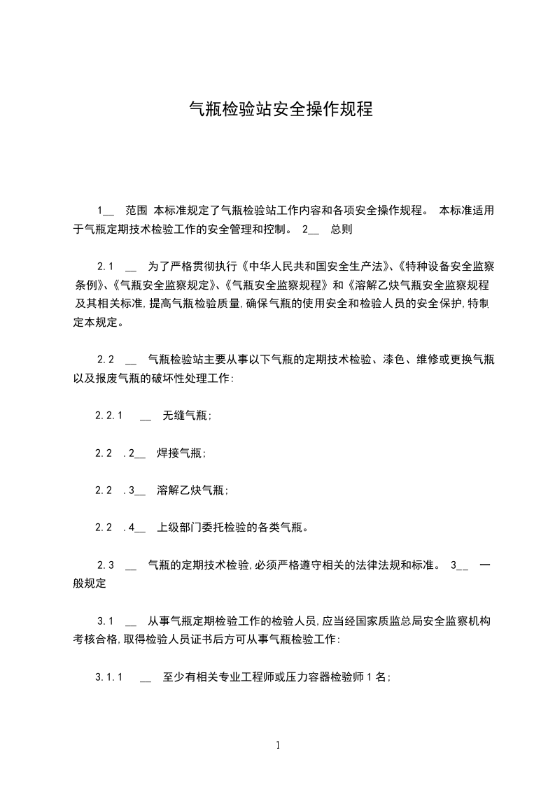 1__ 范围 本标准规定了气瓶检验站工作内容和各项安全操作规程。 本标准适用于气瓶定期技术检验工作的安全管理和控制。 2__ 总则