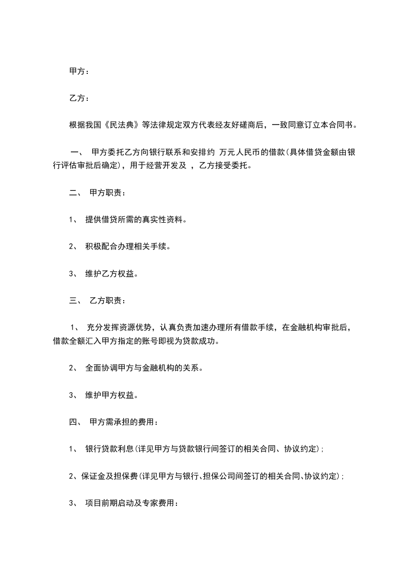 一、 甲方委托乙方向银行联系和安排约 万元人民币的借款(具体借贷金额由银行评估审批后确定),用于经营开发及 ,乙方接受委托。
