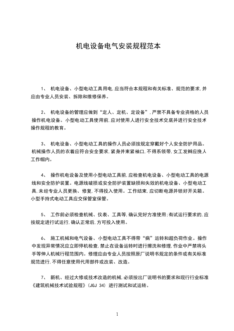 1、 机电设备、小型电动工具用电,应当符合本规程和有关标准、规范的要求,并应由专业人员安装、拆除和维修保养。