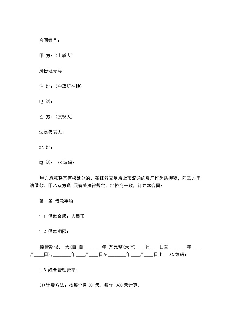 甲方愿意将其有权处分的、在证券交易所上市流通的资产作为质押物,向乙方申请借款。甲乙双方遵 照有关法律规定,经协商一致,订立本合同: