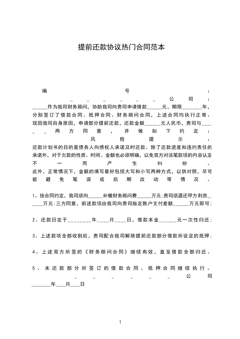 现因我司自身原因,申请部分提前还款,还款金额______元人民币,贵司与______两方同意,并做如下约定: