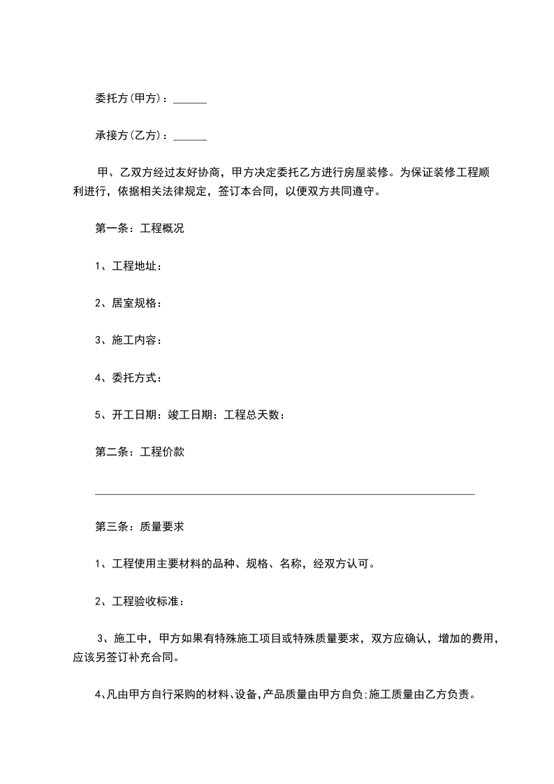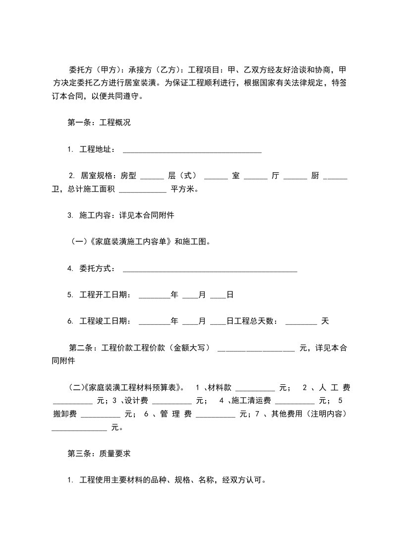 委托方(甲方):承接方(乙方):工程项目:甲、乙双方经友好洽谈和协商,甲方决定委托乙方进行居室装潢。为保证工程顺利进行,根据国家有关法律规定,特签订本合同,以便共同遵守。
