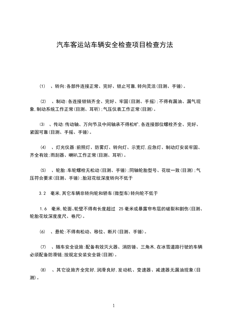 (5) 、轮胎:车轮螺栓无松动(目测、手锤);同轴轮胎型号、花纹一致(目测);气压符合要求(目测、手锤);胎冠花纹深度转向不低于