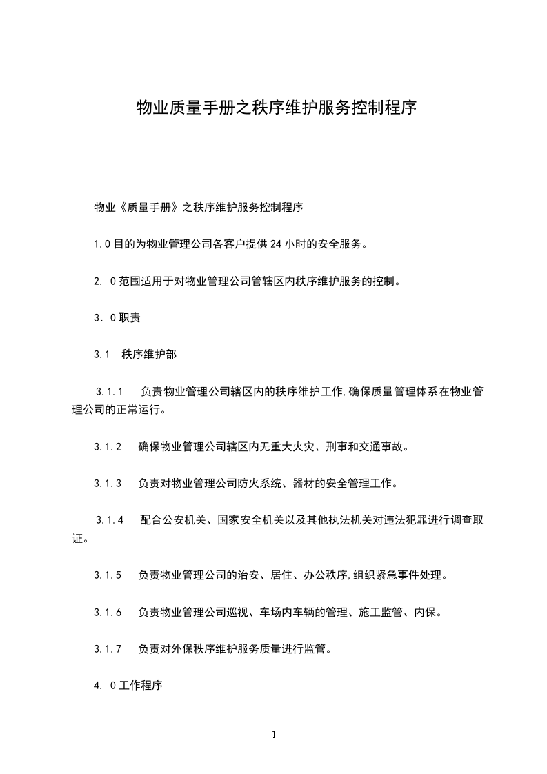 3.1.1 负责物业管理公司辖区内的秩序维护工作,确保质量管理体系在物业管理公司的正常运行。