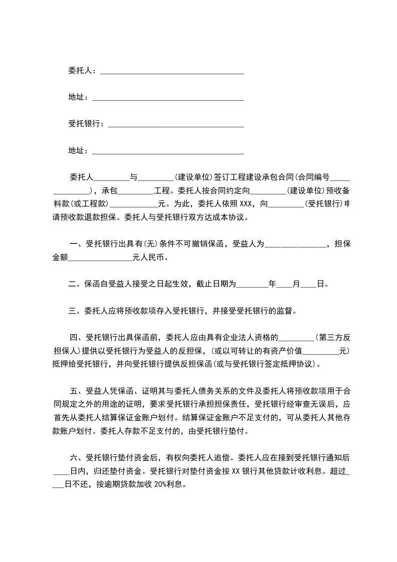 一、受托银行出具有(无)条件不可撤销保函,受益人为_______________,担保金额________________元人民币。