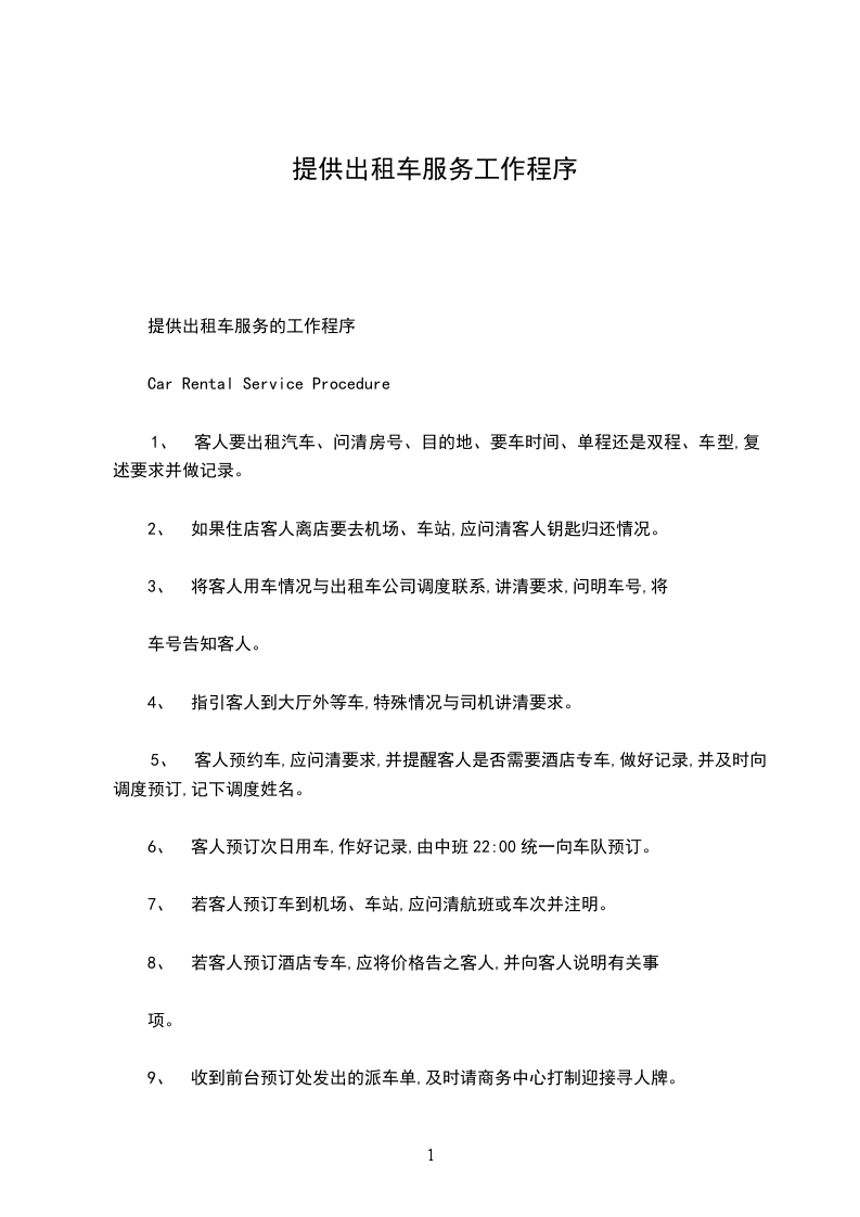 1、 客人要出租汽车、问清房号、目的地、要车时间、单程还是双程、车型,复述要求并做记录。
