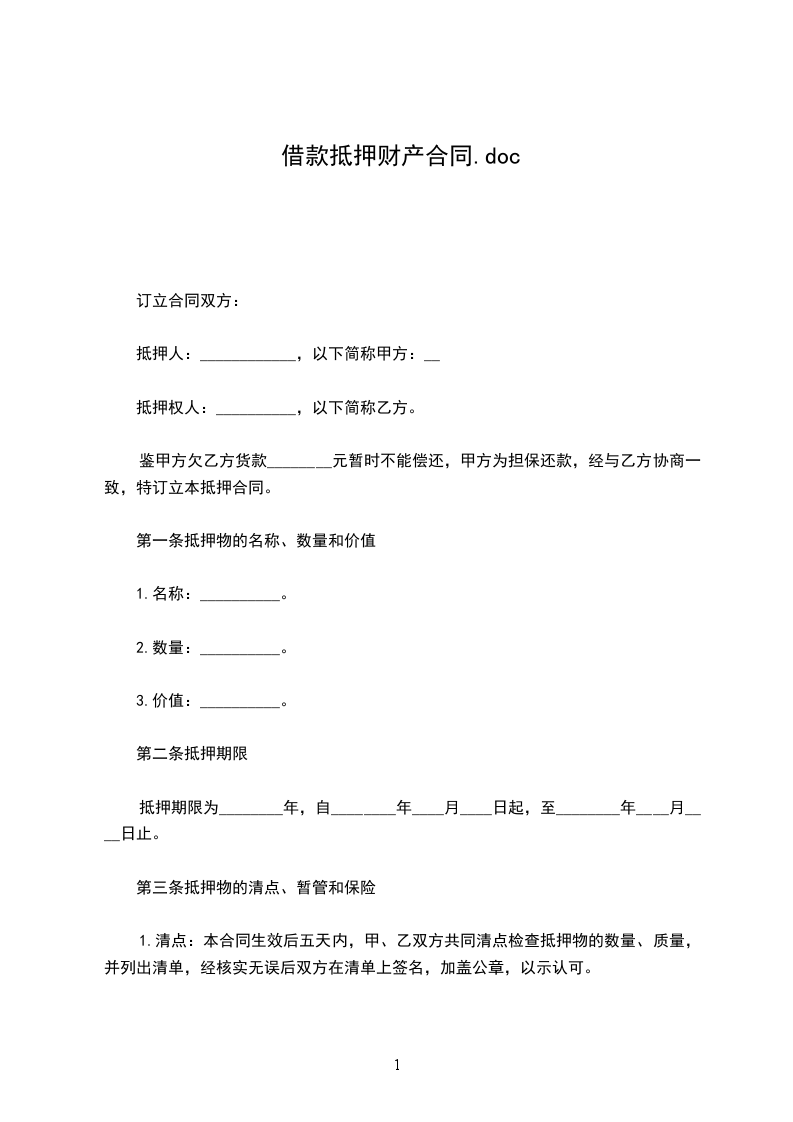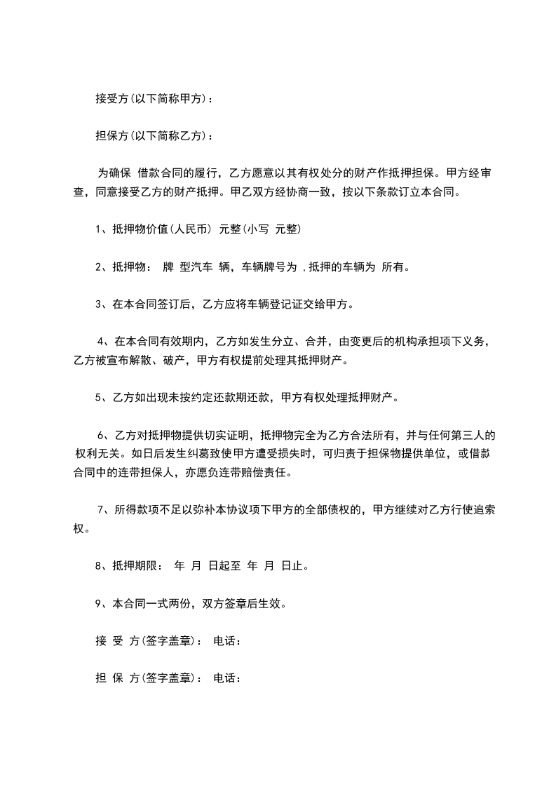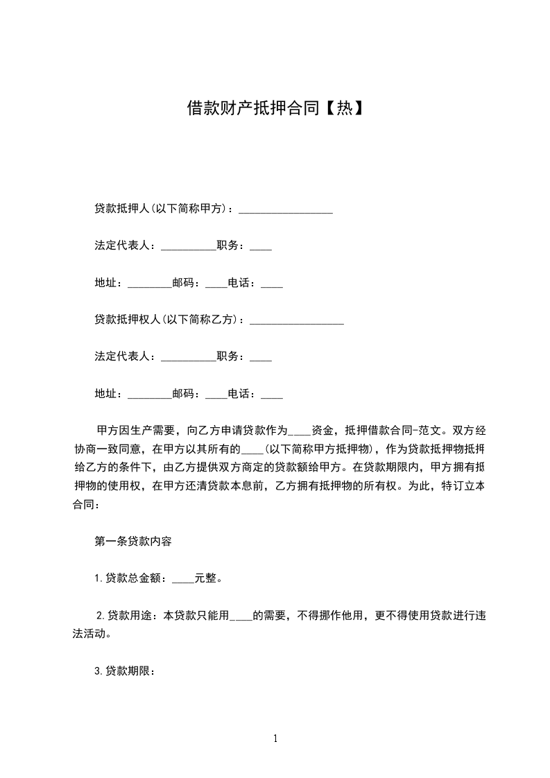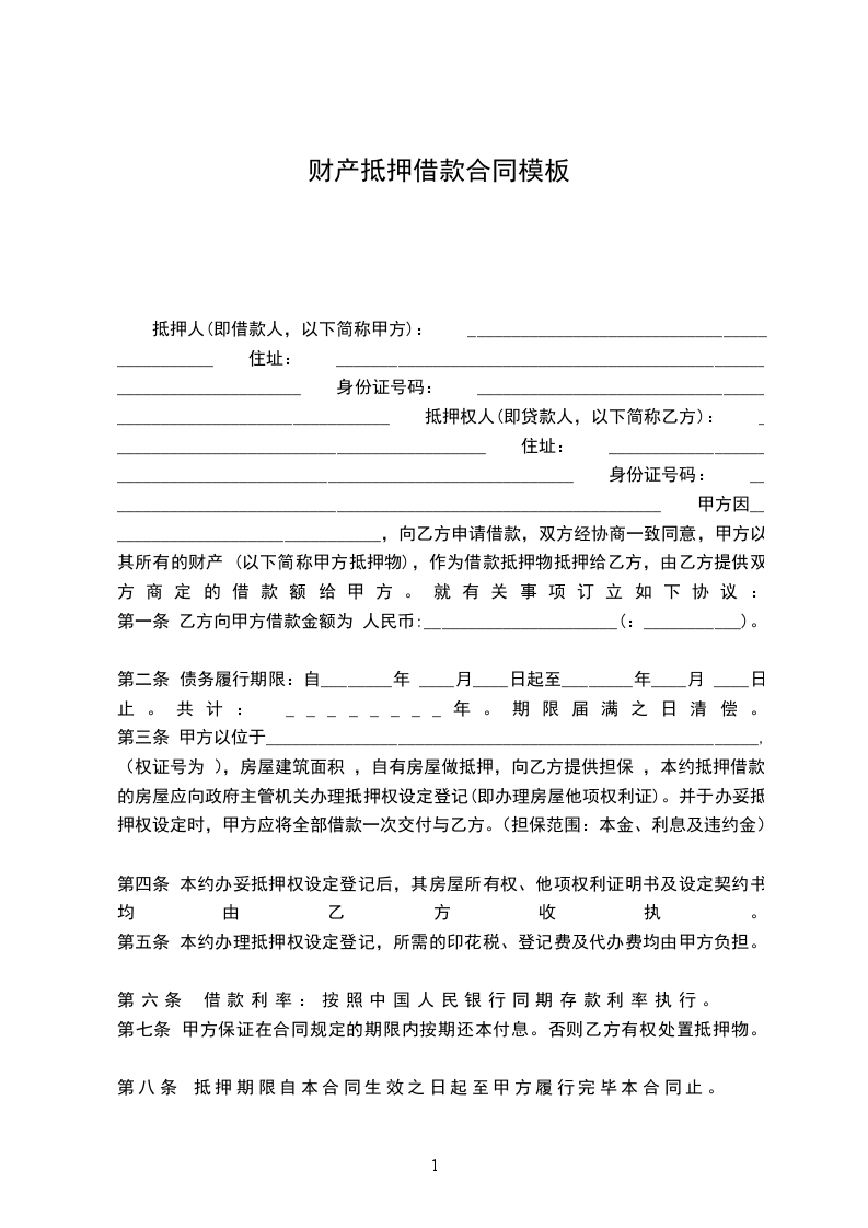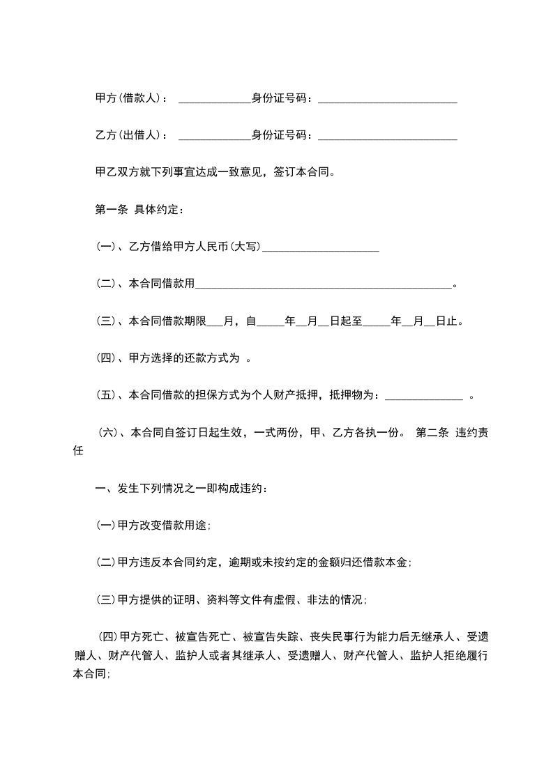 抵押人(即借款人,以下简称甲方): _____________________________________________ 住址: ______________________________________________________________________ 身份证号码: ________________________________________________________________ 抵押权人(即贷款人,以下简称乙方): ___________________________________________ 住址: ______________________________________________________________________ 身份证号码: ________________________________________________________________ 甲方因________________________________,向乙方申请借款,双方经协商一致同意,甲方以其所有的财产 (以下简称甲方抵押物),作为借款抵押物抵押给乙方,由乙方提供双方商定的借款额给甲方。就有关事项订立如下协议: