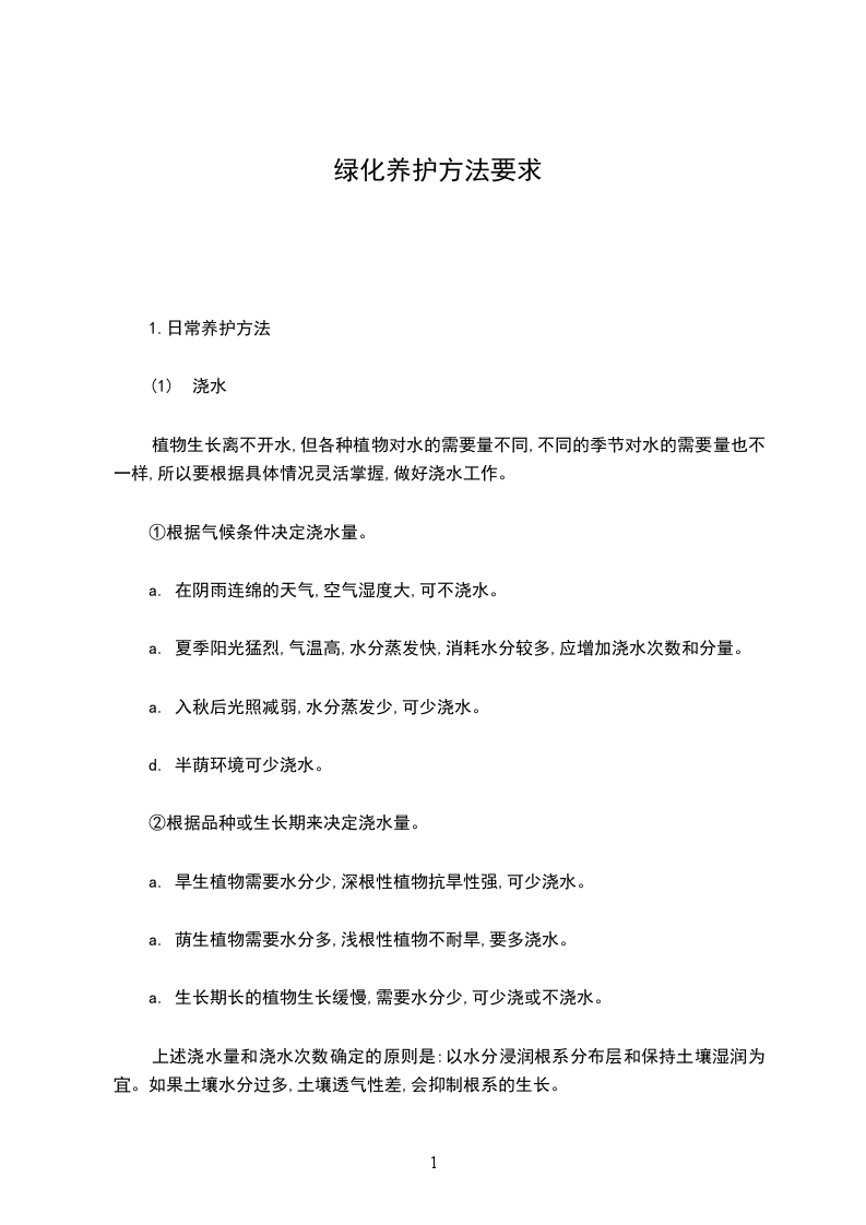 住宅楼内阴性植物每星期必须浇水两次,住宅楼外阴性植物除雨天、阴天外,每天早晨须浇水一次(含绿化带、草坪、树木),如遇暴晒天气,每天下午须再浇水一次。花圃内的阴性植物由于受到纱网的遮阴每天早上浇水一次即可(雨天除外);花圃内的阳性植物每天早晨浇水一次(雨天除外);如遇暴晒天气,每天下午须再浇水一次。