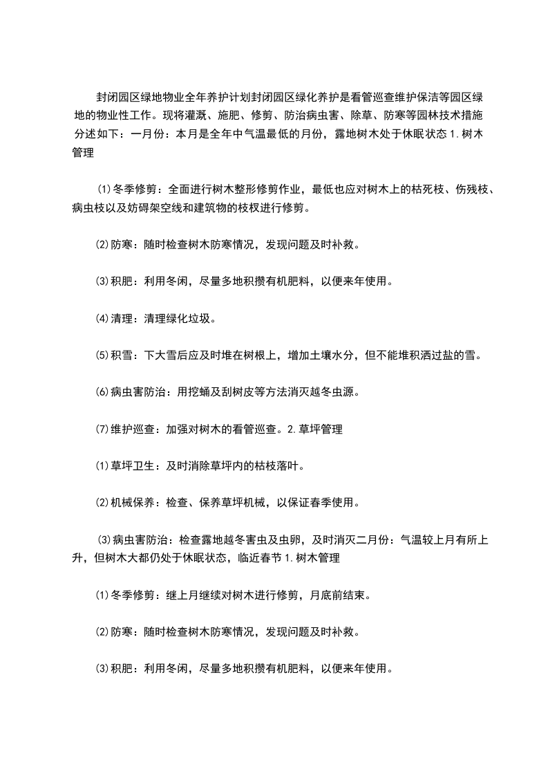 6.3 绿化工作标准(以下标准每天检查一次):分类项目标准频率检查方法修剪灌木双夹槐等成型、整齐、美观新长枝不超过30厘米。视长势而定目视柚查3处乔木无枯枝,树木阴车辆和行人通过,主侧枝分布均匀。每年一次目视抽查10棵。绿篱、黄金叶等平整、成型,新长枝不超过20厘米。视长势而定目视抽查3处,30平方米草坪草坪夏季长不超过8厘米,冬季不超过12厘米,边、角整齐,目视平整。夏季每月一次冬季两月一次目视抽查3处,90平方米施肥乔木、灌木采用穴施或沟放,施后覆土平整,肥不露出土面,浇水及时。乔木每年二次灌木每季一次目视检查花卉保证基肥、追施化肥,少量多次不伤花草。视长势而定目视检查草坪播施和喷施,不伤花草每季一次目视检查病虫防治无明显枯枝、死杈,有虫害枝条2%以下。每月防治一次,发现病虫及时喷药。目视检查浇水花卉、苗泥土不染花叶,土不压苗心,水不冲倒苗。每天一次,必要时两次。目视检查树木、草地、绿篱等冬季早晚不浇水,夏季中午不浇水。浇水不遗漏,要浇透,无旱死、旱枯的现象。每周两次,雨后除外目视检查日常养护中耕、松土、除杂草无明显杂草,草坪的纯度在90%以上,树木、苗底下土面层不板结,透气良好。施肥和暴雨后松土,全年不少于6次。抽查草坪50平方米3处,取平均值,花池目视检查补栽补种无明显黄土裸露,最大裸块0.4平方米,裸露面积在总面积1%以下,缺株0.15%以下。按栽种季节及时补栽补种。抽查5处,汇总计算。防风、排涝暴风雨后12小时,草地花池无1m2以上的积水,树木无倒斜,断枝落叶半天处理。暴雨后及时巡视、处理。目视检查落叶清扫树下花池、花槽无明显落叶。视落叶情况定目视检查苗圃归类摆放整齐,品种多,能供应小区室内、室外摆花,花苗长势良好,盆花造型美观。每天养护目视检查摆花室内外盆花无枯枝,无杂物,盆身盆底清洁、室内盆花叶片无积尘。视情况而定目视检查