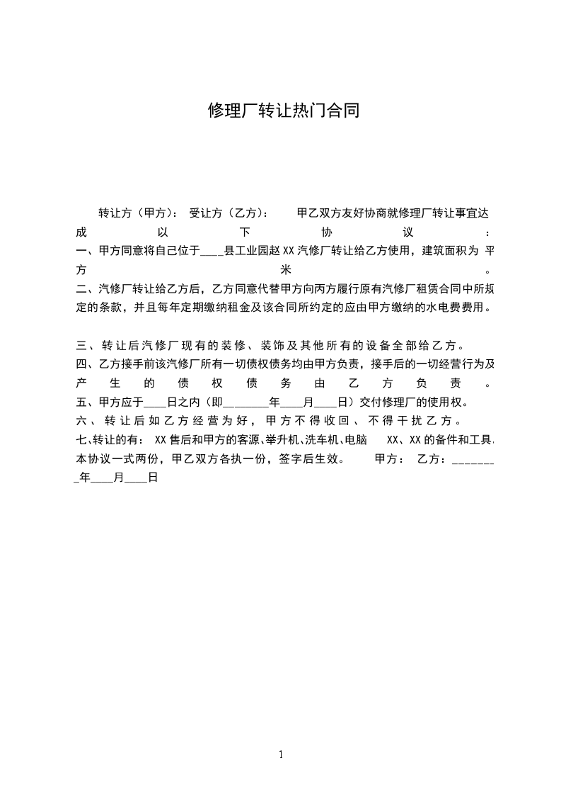 转让方(甲方): 受让方(乙方): 甲乙双方友好协商就修理厂转让事宜达成以下协议:
