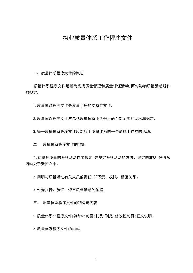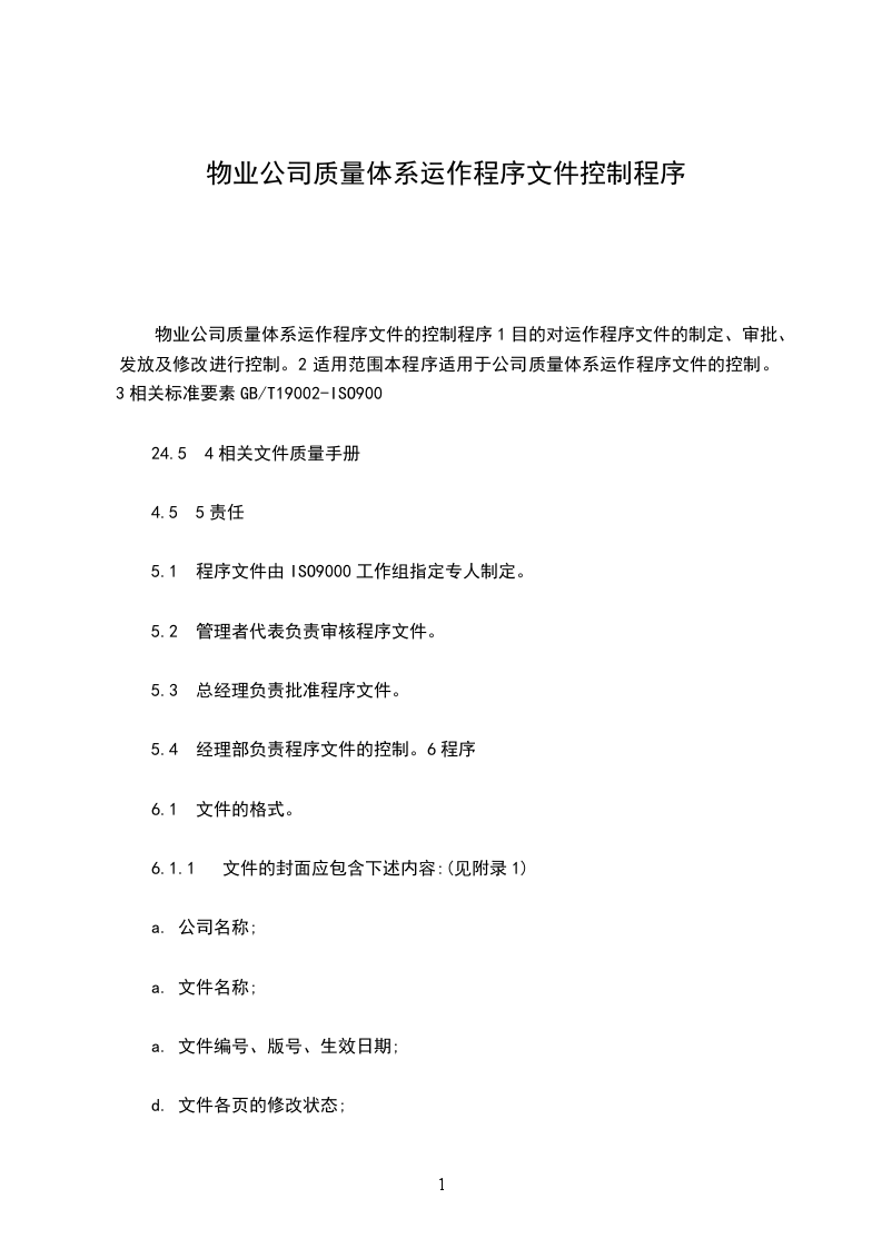物业公司质量体系运作程序文件的控制程序1目的对运作程序文件的制定、审批、发放及修改进行控制。2适用范围本程序适用于公司质量体系运作程序文件的控制。3相关标准要素GB/T19002-ISO900