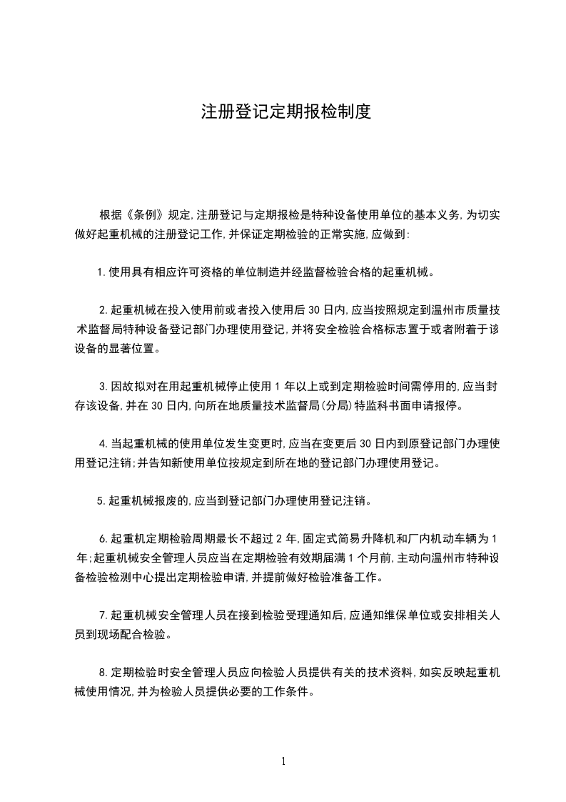 6.起重机定期检验周期最长不超过2年,固定式简易升降机和厂内机动车辆为1年;起重机械安全管理人员应当在定期检验有效期届满1个月前,主动向温州市特种设备检验检测中心提出定期检验申请,并提前做好检验准备工作。