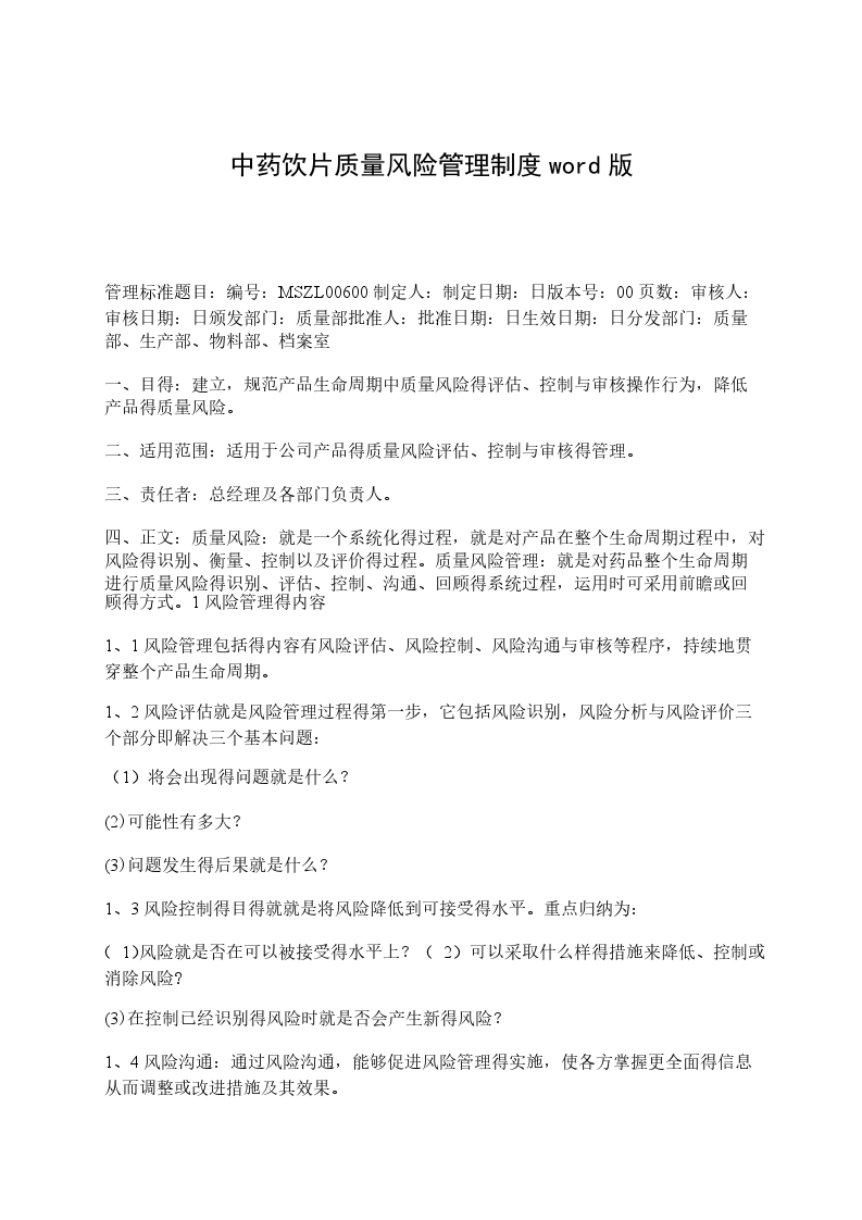 一、风险管控目标 以开展药品生产、经营质量安全风险管控工作为抓手,通过排查潜在的影响药品生产、经营质量安全的风险对象、风险环节、风险品种、风险时段等“风险点”,形成标准化、规范化、操作性强的风险排查评估、风险意识教育、风险管控承诺、风险责任追究、风险监督检查等监管和防控机制,促进企业切实履行药品质量责任,建立药品生产、经营质量安全风险管控长效机制,从而达到有效预防、有效控制、有效处置药品质量风险发生。