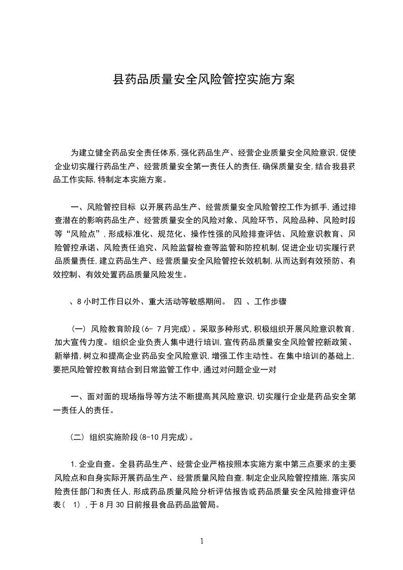 1.企业自查。全县药品生产、经营企业严格按照本实施方案中第三点要求的主要风险点和自身实际开展药品生产、经营质量风险自查,制定企业风险管控措施,落实风险责任部门和责任人,形成药品质量风险分析评估报告或药品质量安全风险排查评估表( 1) ,于8月30日前报县食品药品监管局。
