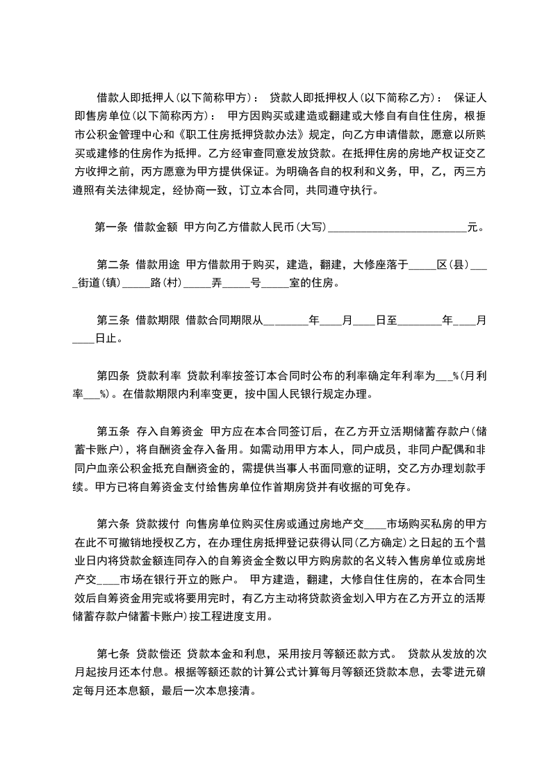借款人即抵押人(以下简称甲方): 贷款人即抵押权人(以下简称乙方): 保证人即售房单位(以下简称丙方): 甲方因购买或建造或翻建或大修自有自住住房,根据市公积金管理中心和《职工住房抵押贷款办法》规定,向乙方申请借款,愿意以所购买或建修的住房作为抵押。乙方经审查同意发放贷款。在抵押住房的房地产权证交乙方收押之前,丙方愿意为甲方提供保证。为明确各自的权利和义务,甲,乙,丙三方遵照有关法律规定,经协商一致,订立本合同,共同遵守执行。