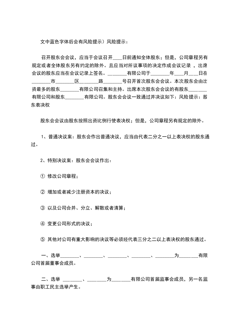 召开股东会会议,应当于会议召开____日前通知全体股东;但是,公司章程另有规定或者全体股东另有约定的除外。且应当对所议事项的决定作成会议记录 ,出席会议的股东应当在会议记录上签名。________有限公司于________年____月____日在________市________区________路________号召开首次股东会会议。本次股东会由出资最多的股东________有限公司召集和主持。出席本次股东会会议的有股东________有限公司和股东________有限公司。股东会会议一致通过并决议如下:风险提示:股东表决权