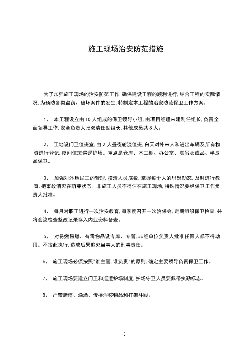 1、 本工程设立由10人组成的保卫领导小组,由项目经理宋建刚任组长,负责全面领导工作,安全负责人张双清任副组长,其他成员共8人。