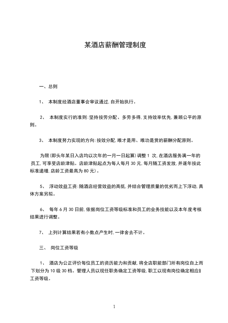 1、 酒店为公正评价每位员工的资历能力和贡献,将全店职能部门所有岗位自上而下划分为10级30档。管理人员以现任职务确定工资等级,职工以现有岗位确定相应的工资等级。