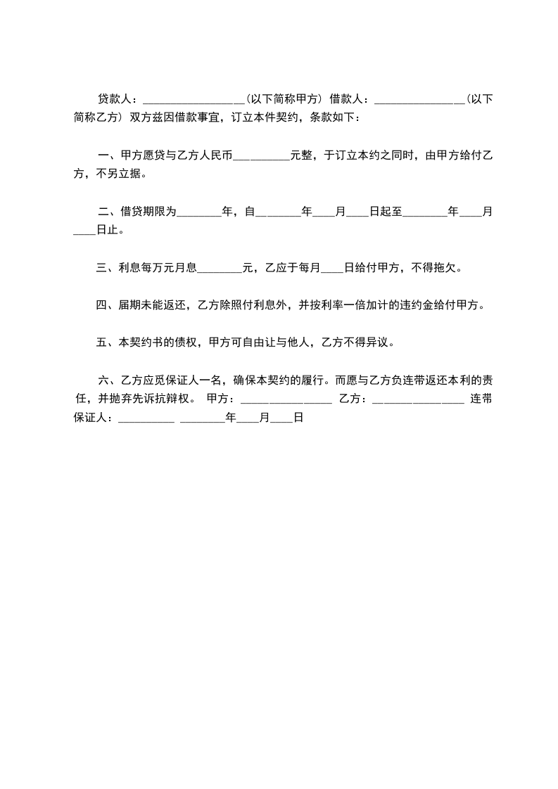 一、甲方愿贷与乙方人民币__________元整,于订立本约之同时,由甲方给付乙方,不另立据。