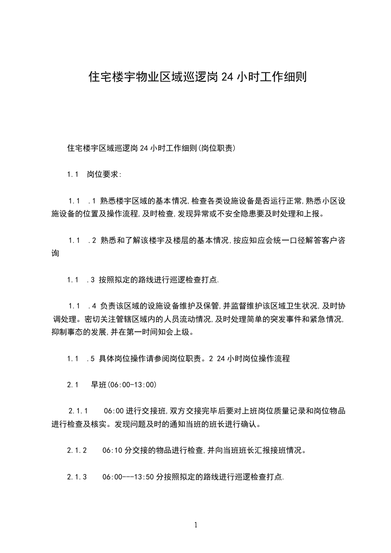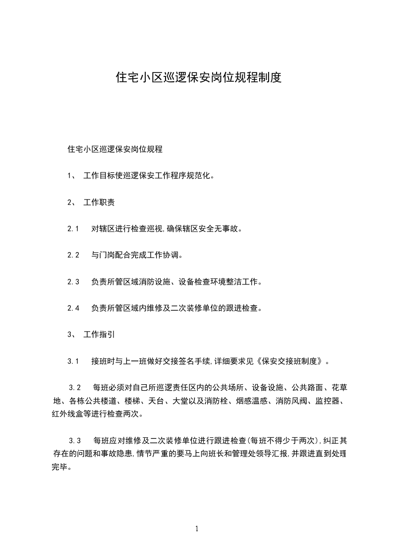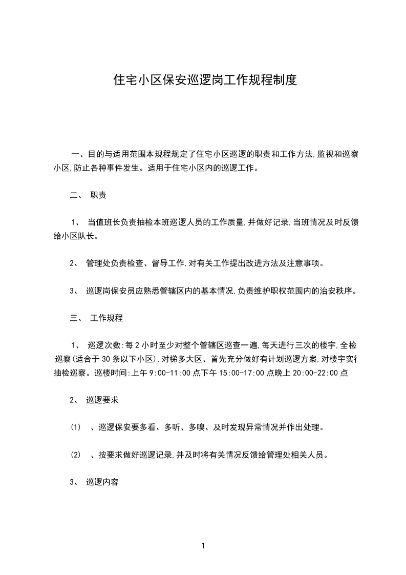 一、目的与适用范围本规程规定了住宅小区巡逻的职责和工作方法,监视和巡察小区,防止各种事件发生。适用于住宅小区内的巡逻工作。