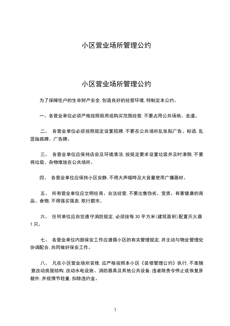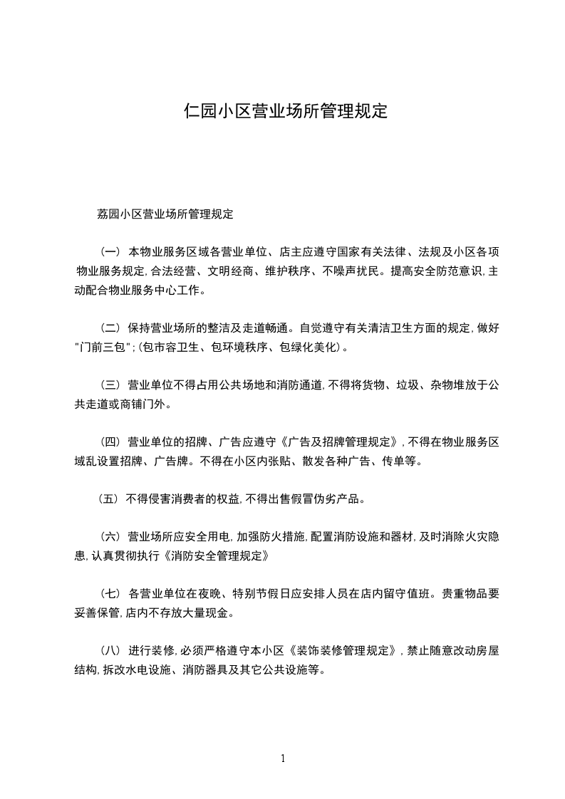 (一) 本物业服务区域各营业单位、店主应遵守国家有关法律、法规及小区各项物业服务规定,合法经营、文明经商、维护秩序、不噪声扰民。提高安全防范意识,主动配合物业服务中心工作。