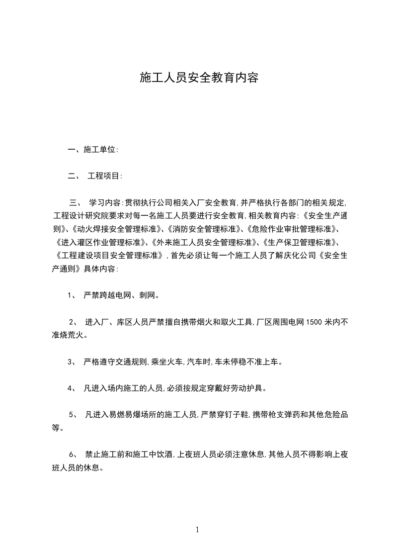 三、 学习内容:贯彻执行公司相关入厂安全教育,并严格执行各部门的相关规定,工程设计研究院要求对每一名施工人员要进行安全教育,相关教育内容:《安全生产通则》、《动火焊接安全管理标准》、《消防安全管理标准》、《危险作业审批管理标准》、《进入灌区作业管理标准》、《外来施工人员安全管理标准》、《生产保卫管理标准》、《工程建设项目安全管理标准》,首先必须让每一个施工人员了解庆化公司《安全生产通则》具体内容: