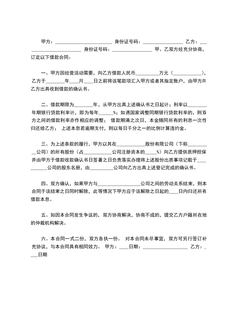 四、双方确认,如果甲方与__________________公司之间的劳动关系结束,则本合同于该结束之日同时解除,此等情况下甲方应于该解除之日起的____日内归还所有借款本息。