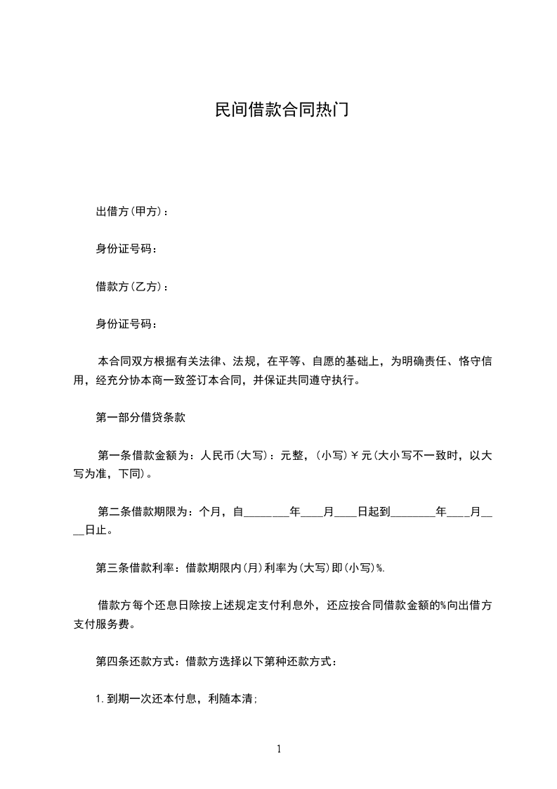 甲方(出借人) 身份证号码: 乙方(借款人) 身份证号码: 为了明确责任,恪守信用,在双方自愿、协商情况下特 签订本合同以资共同信守。