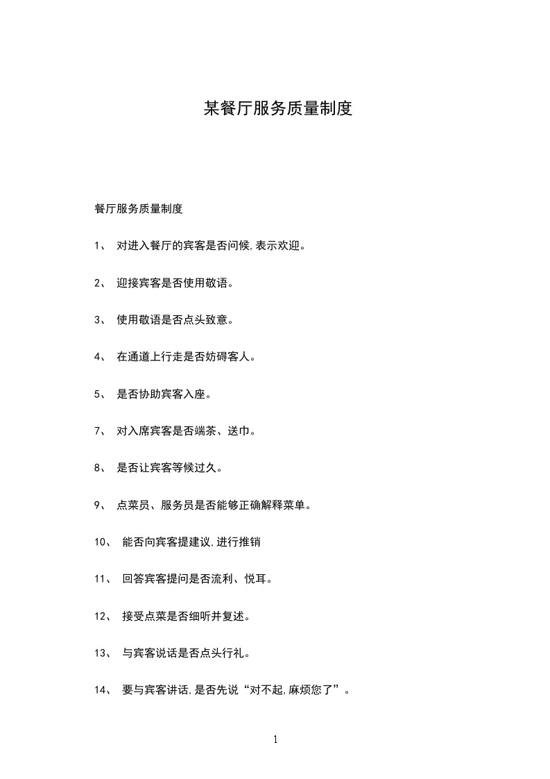 餐厅服务质量制度
