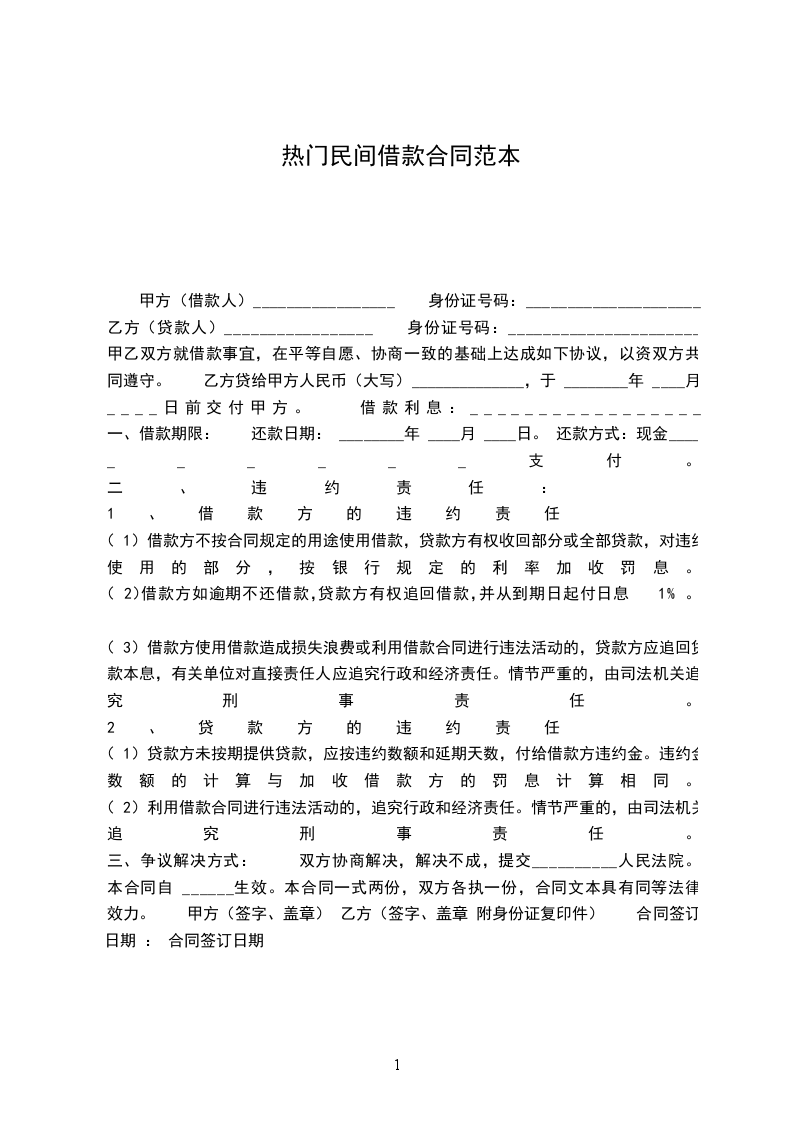 甲方(借款人)_________________ 身份证号码:_____________________ 乙方(贷款人)_________________ 身份证号码:______________________ 甲乙双方就借款事宜,在平等自愿、协商一致的基础上达成如下协议,以资双方共同遵守。 乙方贷给甲方人民币(大写)______________,于 ________年 ____月 ____日前交付甲方。 借款利息:_________________