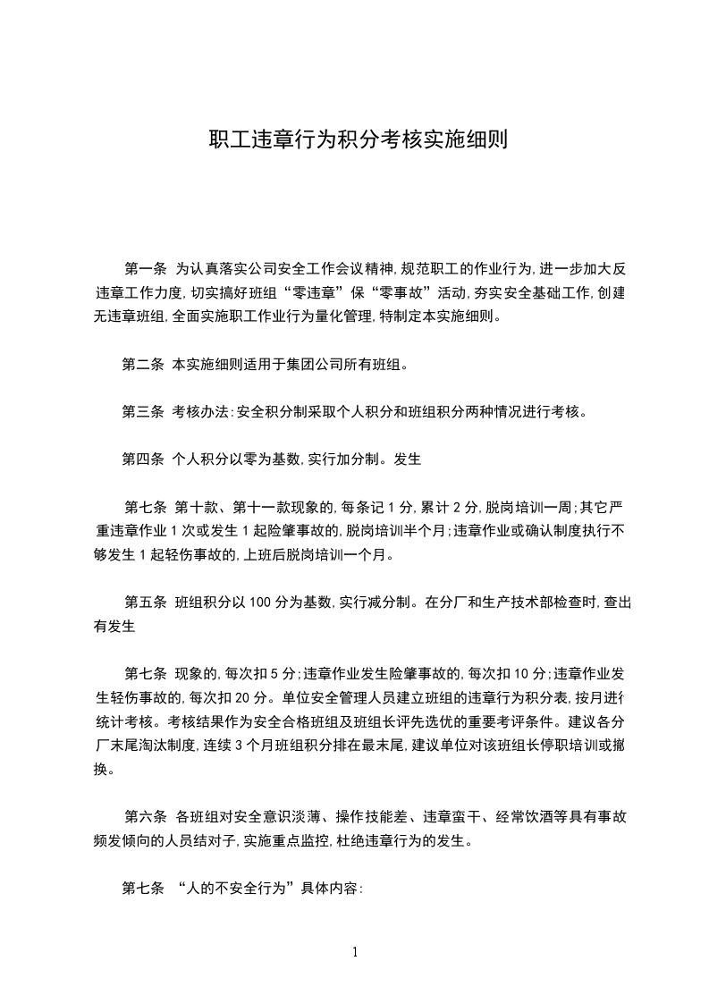 第七条 现象的,每次扣5分;违章作业发生险肇事故的,每次扣10分;违章作业发生轻伤事故的,每次扣20分。单位安全管理人员建立班组的违章行为积分表,按月进行统计考核。考核结果作为安全合格班组及班组长评先选优的重要考评条件。建议各分厂末尾淘汰制度,连续3个月班组积分排在最末尾,建议单位对该班组长停职培训或撤换。