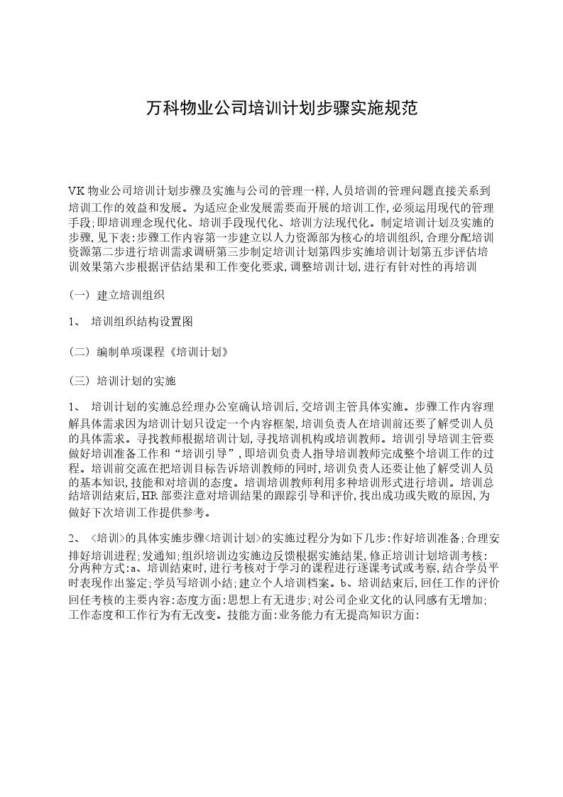 VK物业公司培训计划步骤及实施与公司的管理一样,人员培训的管理问题直接关系到培训工作的效益和发展。为适应企业发展需要而开展的培训工作,必须运用现代的管理手段;即培训理念现代化、培训手段现代化、培训方法现代化。制定培训计划及实施的步骤,见下表:步骤工作内容第一步建立以人力资源部为核心的培训组织,合理分配培训资源第二步进行培训需求调研第三步制定培训计划第四步实施培训计划第五步评估培训效果第六步根据评估结果和工作变化要求,调整培训计划,进行有针对性的再培训