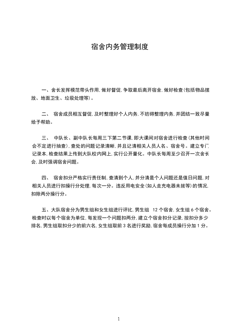 四、 宿舍扣分严格实行责任制,查清到个人,并分清是个人问题还是值日问题,对相关人员进行扣操行分处理,每次一分。违反用电安全(如人走充电器未拔等)的情况,扣除两分操行分。