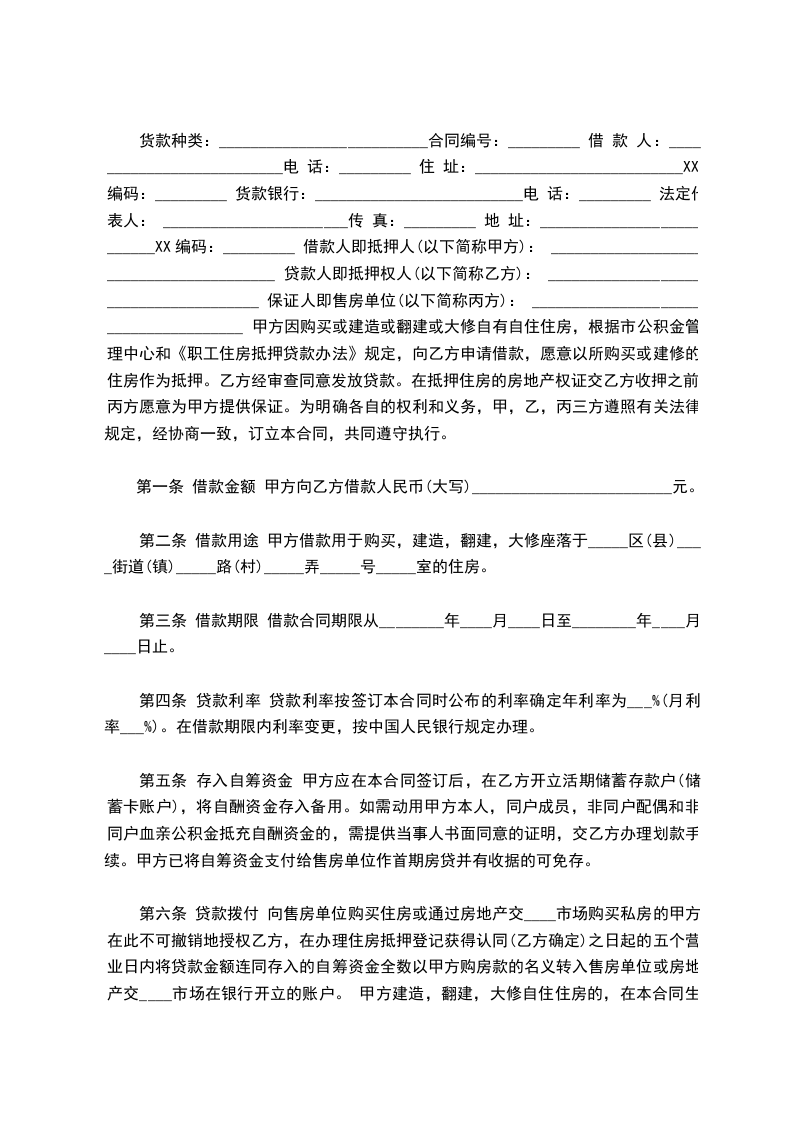 货款种类:__________________________合同编号:_________ 借 款 人:__________________________电 话:_________ 住 址:__________________________XX编码:_________ 货款银行:__________________________电 话:_________ 法定代表人: _______________________传 真:_________ 地 址:__________________________XX编码:_________ 借款人即抵押人(以下简称甲方): ________________________________________ 贷款人即抵押权人(以下简称乙方): ______________________________________ 保证人即售房单位(以下简称丙方): ______________________________________ 甲方因购买或建造或翻建或大修自有自住住房,根据市公积金管理中心和《职工住房抵押贷款办法》规定,向乙方申请借款,愿意以所购买或建修的住房作为抵押。乙方经审查同意发放贷款。在抵押住房的房地产权证交乙方收押之前,丙方愿意为甲方提供保证。为明确各自的权利和义务,甲,乙,丙三方遵照有关法律规定,经协商一致,订立本合同,共同遵守执行。