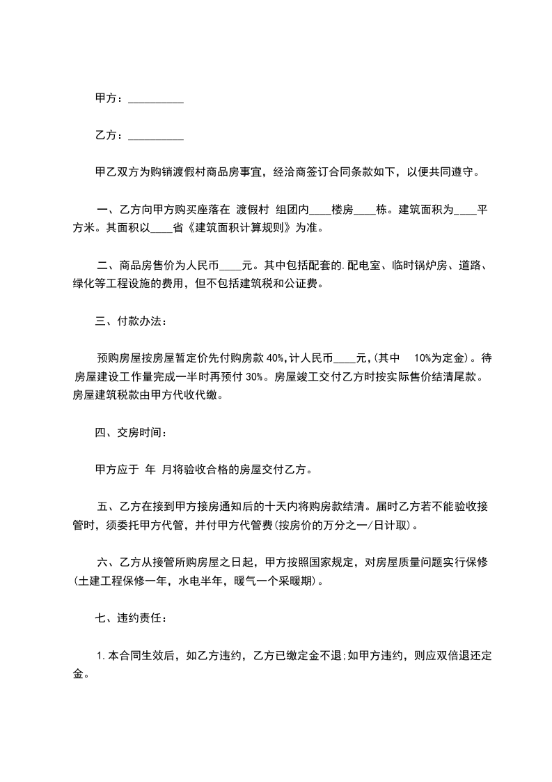 甲乙双方为购销____渡假村商品房事宜,经洽商签订合同条款如下,以便共同遵守。