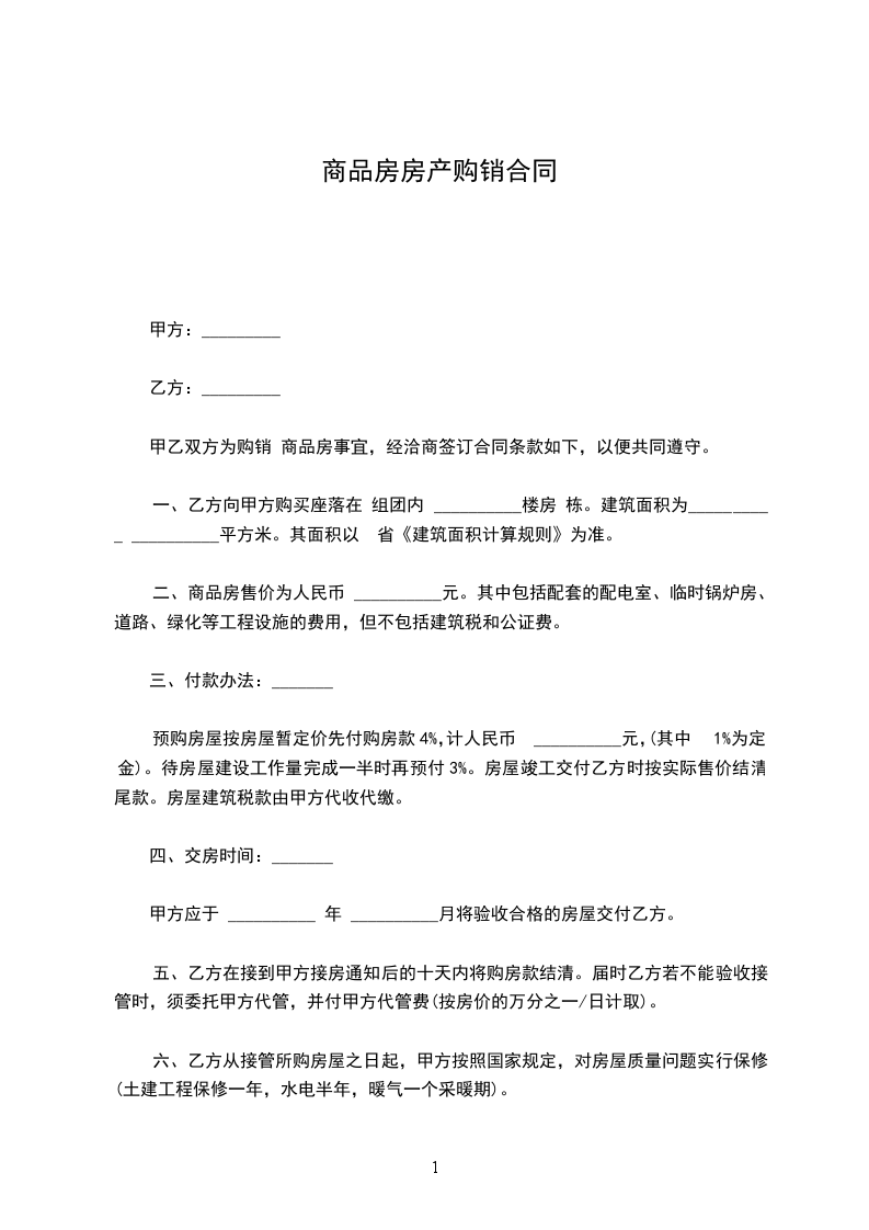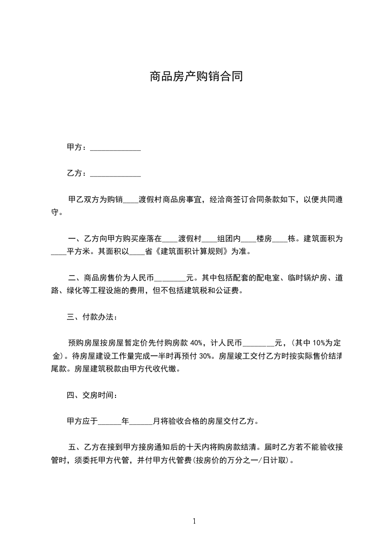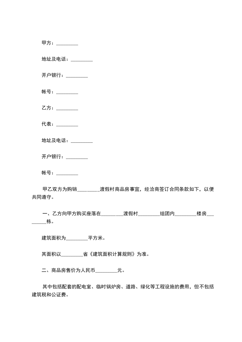 一、乙方向甲方购买座落在____渡假村____组团内____楼房____栋。建筑面积为____平方米。其面积以____省《建筑面积计算规则》为准。