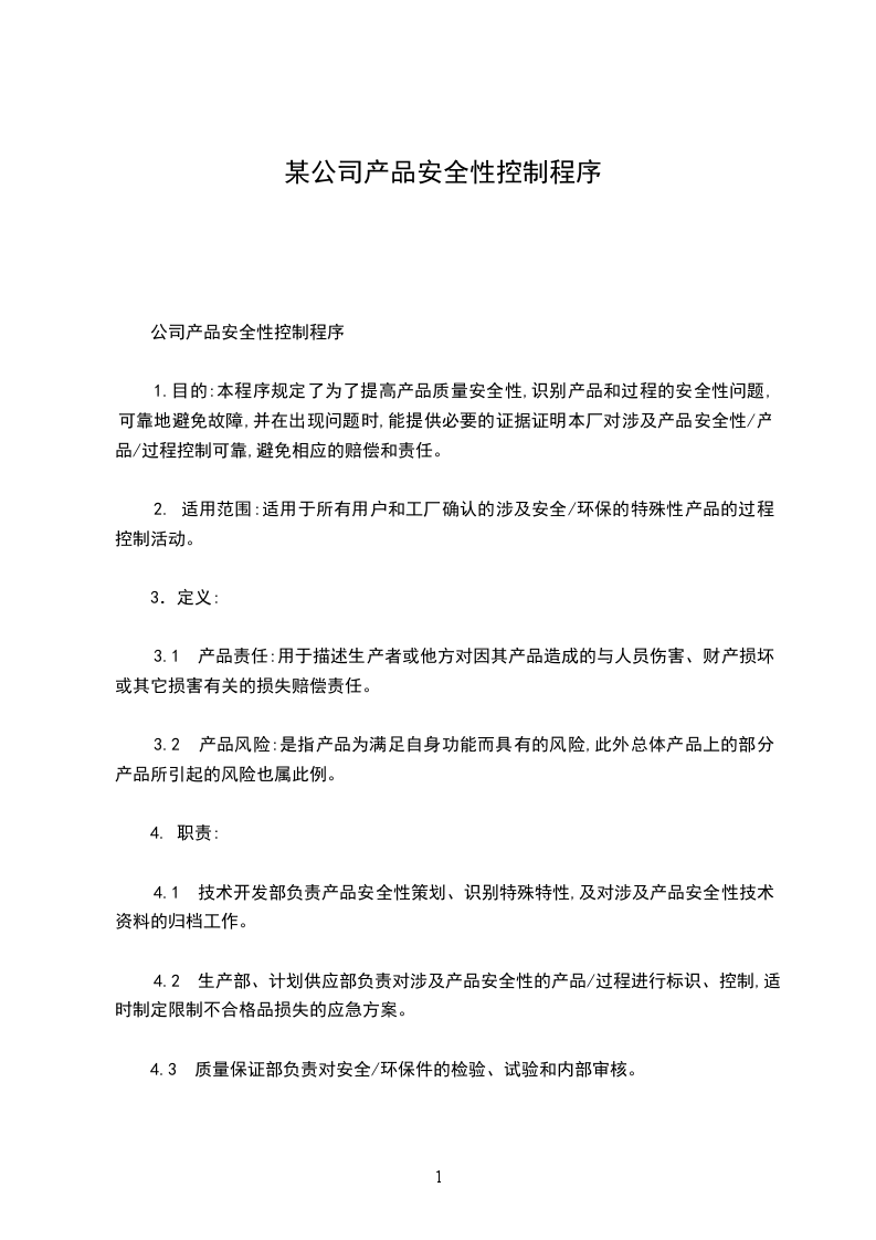 1.目的:本程序规定了为了提高产品质量安全性,识别产品和过程的安全性问题,可靠地避免故障,并在出现问题时,能提供必要的证据证明本厂对涉及产品安全性/产品/过程控制可靠,避免相应的赔偿和责任。