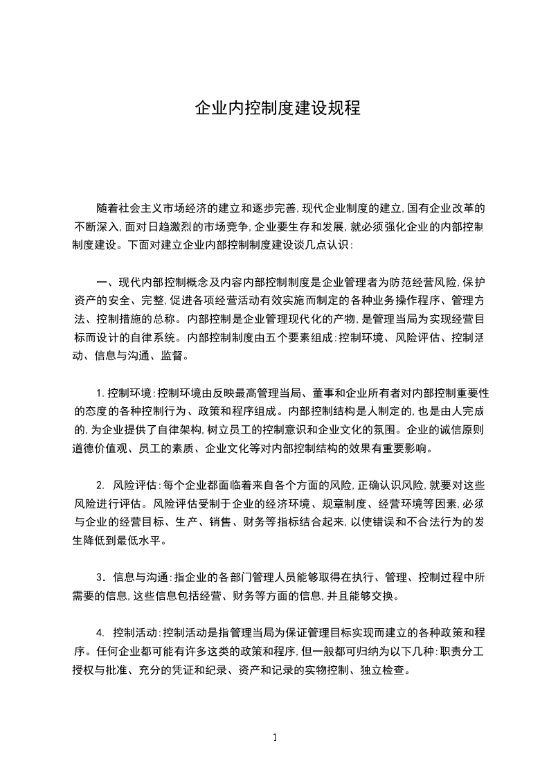 一、现代内部控制概念及内容内部控制制度是企业管理者为防范经营风险,保护资产的安全、完整,促进各项经营活动有效实施而制定的各种业务操作程序、管理方法、控制措施的总称。内部控制是企业管理现代化的产物,是管理当局为实现经营目标而设计的自律系统。内部控制制度由五个要素组成:控制环境、风险评估、控制活动、信息与沟通、监督。