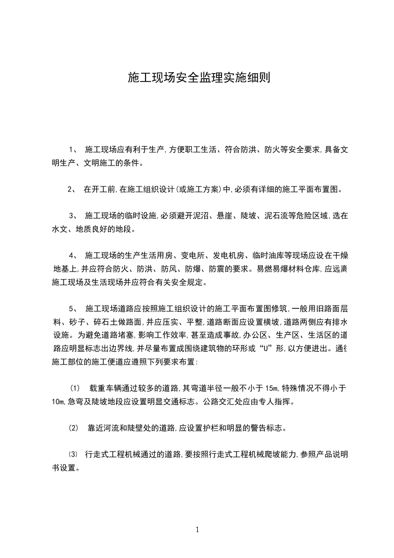 5、 施工现场道路应按照施工组织设计的施工平面布置图修筑,一般用旧路面层料、砂子、碎石土做路面,并应压实、平整,道路断面应设置横坡,道路两侧应有排水设施。为避免道路堵塞,影响工作效率,甚至造成事故,办公区、生产区、生活区的道路应明显标志出边界线,并尽量布置成围绕建筑物的环形或“U”形,以方便进出。通往施工部位的施工便道应遵照下列要求布置: