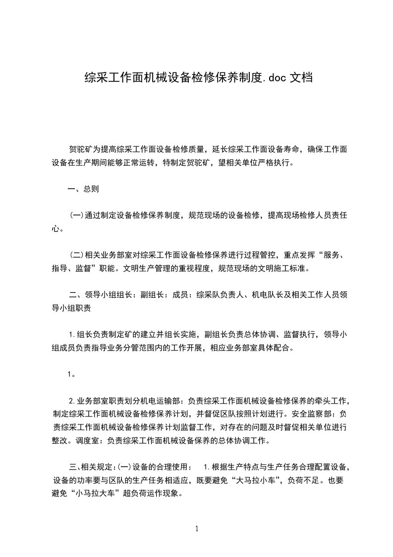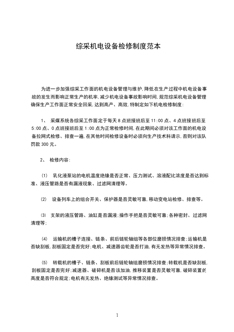 1、 采煤系统各综采工作面定于每天8点班接班后至11:00点、4点班接班后至5:00点、0点班接班后至1:00点为正常检修时间,在此期间必须对该工作面的机电设备拉网式检修、排查一遍,在其他时间检修设备时必须向生产技术科请示,否则对该队罚款300元。